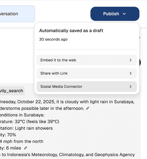 Menyediakan akses konektor yang mulus untuk platform media sosial dan komunikasi populer, memungkinkan agen VeFlow beroperasi di mana saja (Media sosial, export link, situs web).